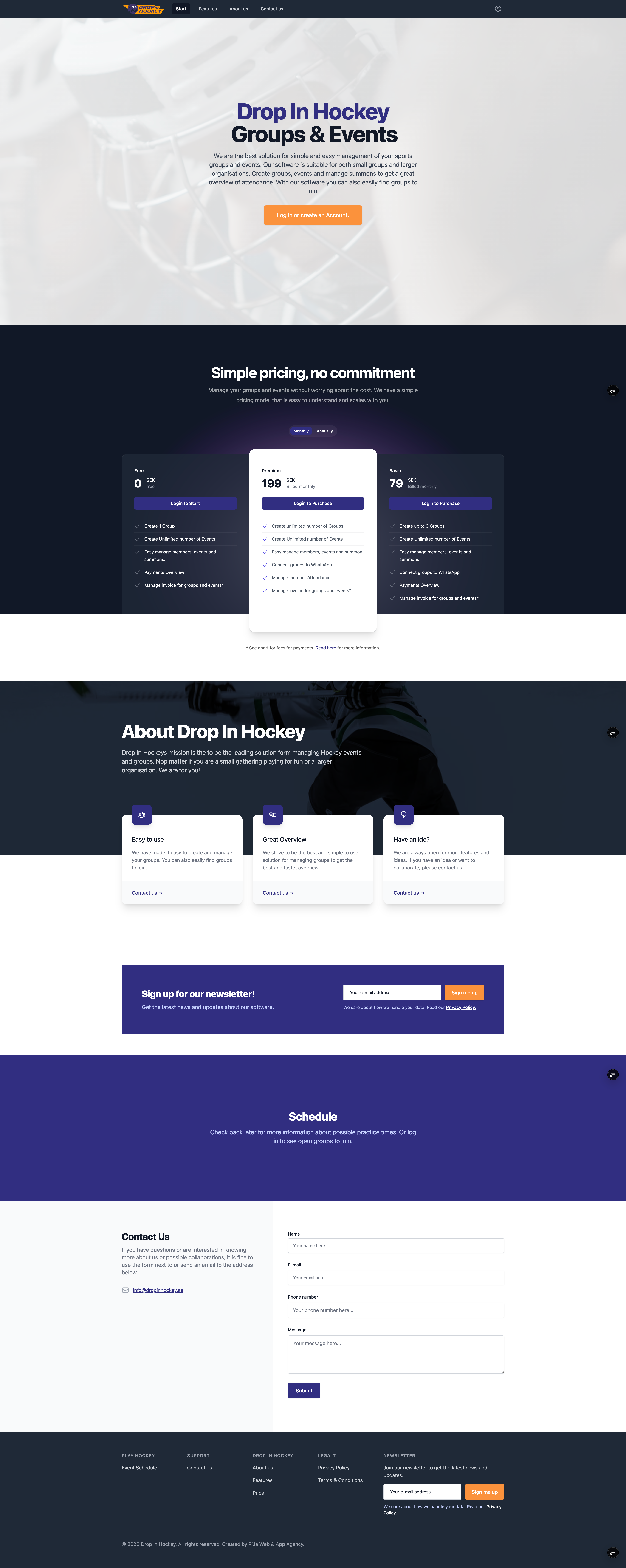 En SaaS-plattform för att organisera drop-in hockey och sportgrupper. Skapa grupper, hantera event, skicka kallelser och ta betalt — allt i en och samma tjänst.